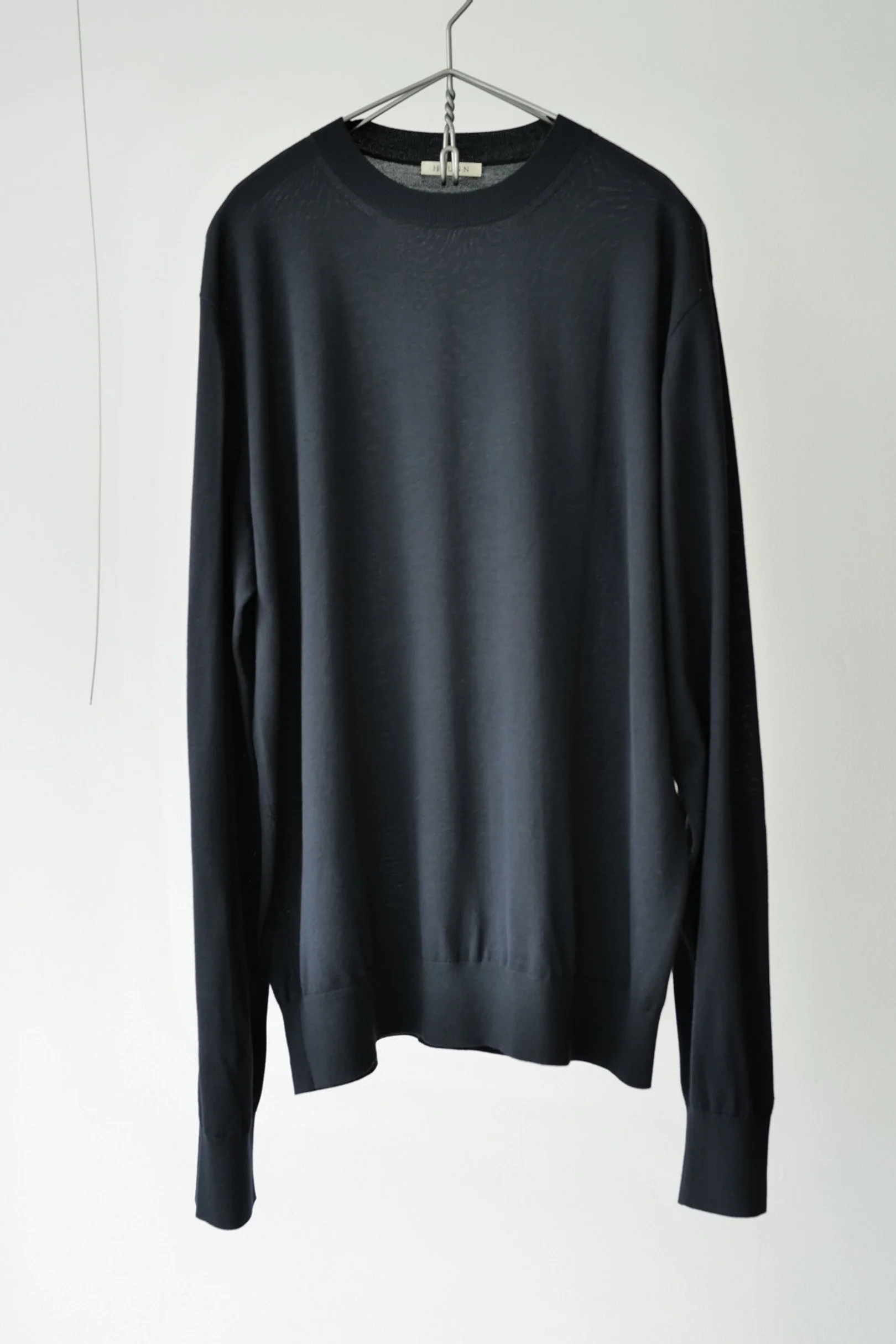 •アメリカのスウェットをイメージしてハイゲージニットに落とし込んでいます。 •エクストラファインの糸をそのまま使用し、極上な肌触りのニットに仕上げています。 •ネックのデザインは、シングルリブの緩めを選択しリラックスした表現にしています。 •肩の傾斜を少し緩くしストレートなラインにしているため、袖も上がりやすい着心地です。 •肩線をストレートにしてヘラシデザインを入れることでニットらしさも残しながらスポーティさ表現しています。 •袖口リブ、裾リブは、太めの幅に設定をしています。スウェットのような雰囲気に仕上げています。